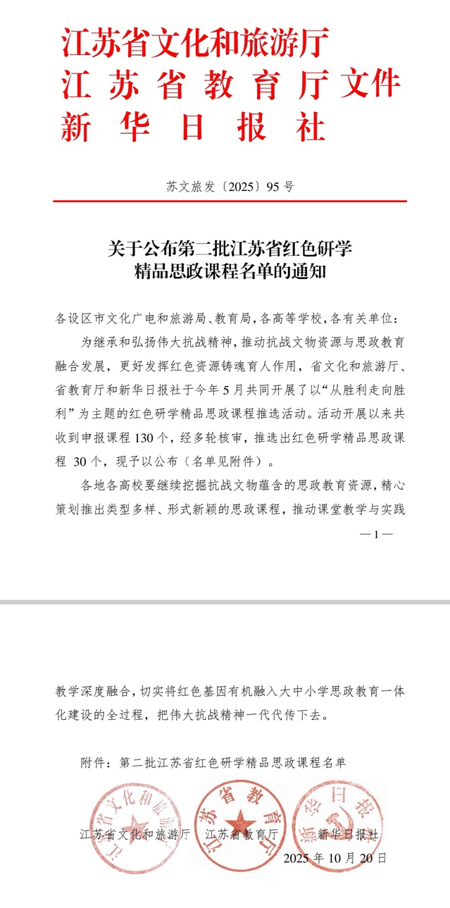 近日,江苏省文化和旅游厅、江苏省教育厅和新华日报社共同发布《关于公布第二批江苏省红色研学精品思政课程名单的通知》(苏文旅发〔2025〕95号)。由我院张翔兮老师设计申报的课程《淮海地区抗战歌谣——从胜利走向胜利的精神印记》成功入选。