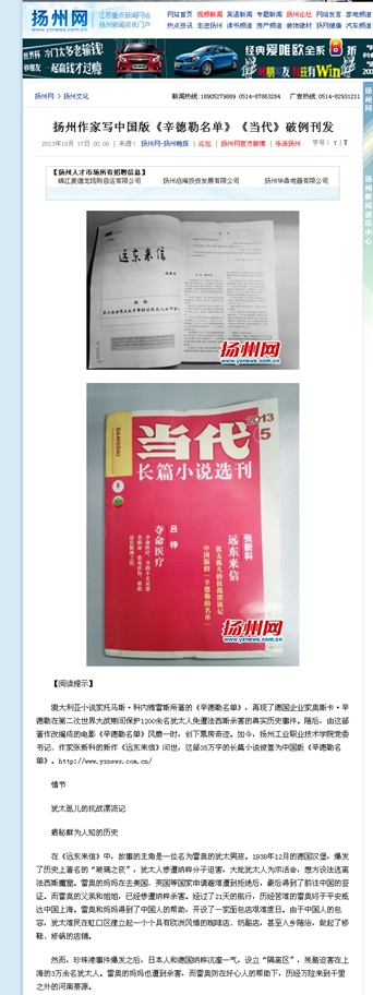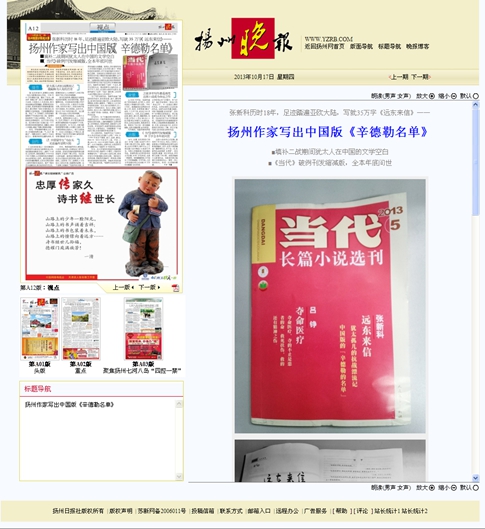 扬州网及扬州报纸对《当代》长篇小说选刊刊发张新科小说《远东来信》的报道
