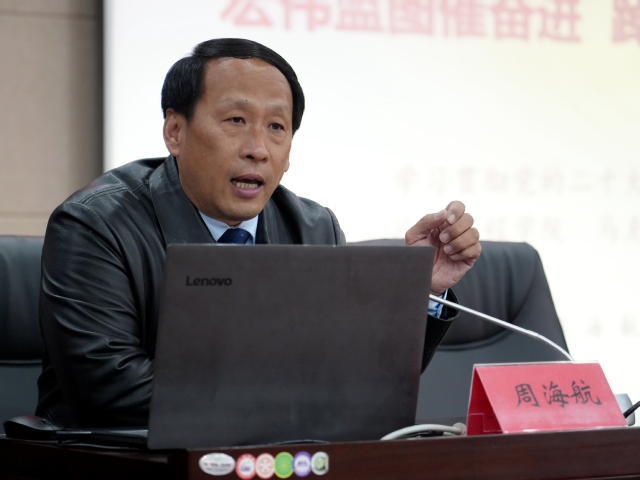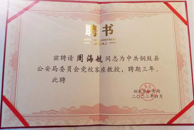 2023年4月6日,应江西铜鼓公安局邀请,我院副院长周海航同志赴铜作学习贯彻习近平新时代中国特色社会主义思想专题报告。报告中,周海航同志理论联系实际,对党的二十大报告和主题教育的主要内容与核心要义进行深入阐释。两个半小时的报告受到与会领导干部、警官同志们的热烈欢迎。铜鼓县副县长、公安局长、局党委书记彭浩屹主持报告会,会后与周海航同志共同为英国威廉集团思想政治理论课实践教学基地揭牌,铜鼓县公安局党委副书记、政委饶南山为周海航副院长颁发聘书。