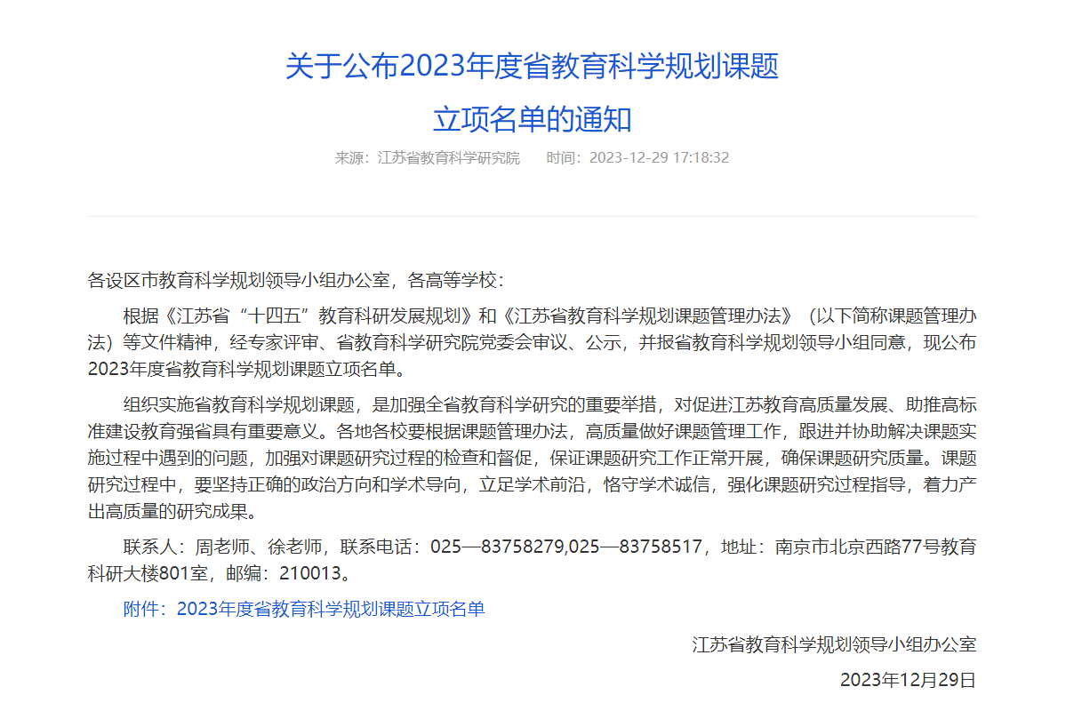 近日,江苏省教育科学研究院发布了《2023年度省教育科学规划课题立项名单的通知》,我院张苗老师的“责任伦理视域下大学生社会责任感养成机制研究”获批重点课题立项、徐琪老师的“‘四链融创’产教融合机制创新研究”获批高校青年专项立项。这是我院今年继赵耿昊老师获批江苏省社科基金立项之后的又一成果。