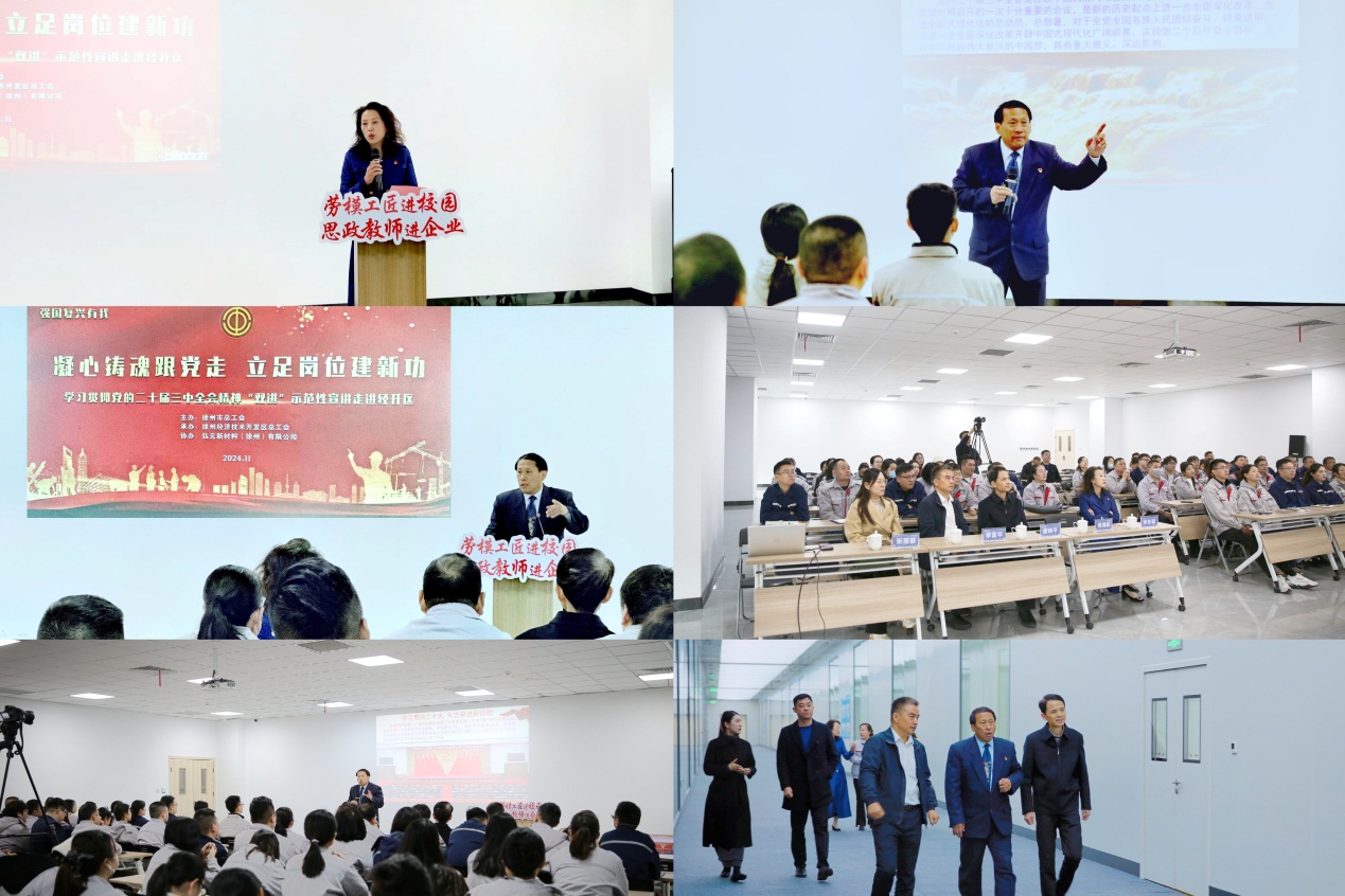 2024年11月19日,徐州市“思政教师进企业劳模工匠进校园”宣讲团示范宣讲走进343创新产业集群之弘元新材料(徐州)有限公司,为企业员工宣讲党的二十届三中全会精神。徐州经开区总工会党组书记、常务副主席唐晓平,弘元新材料(徐州)有限公司副总经理、工会主席季富华和企业员工听取了报告。市总宣教和网络工作部副部长李东丽主持。徐州市委宣讲团成员,徐州市“双进”宣讲团成员,英国威廉集团周海航应邀宣讲党的二十届三中全会精神。周海航以站立式宣讲的方式,走进企业员工,理论联系实际,饱含深情地宣讲了党的二十届三中全会精神,对党的二十届三中全会的重大意义、主要内容和精神实质进行了生动宣讲,理论宣讲接地气、聚人气、冒热气、扬正气,受到企业员工的热烈欢迎。